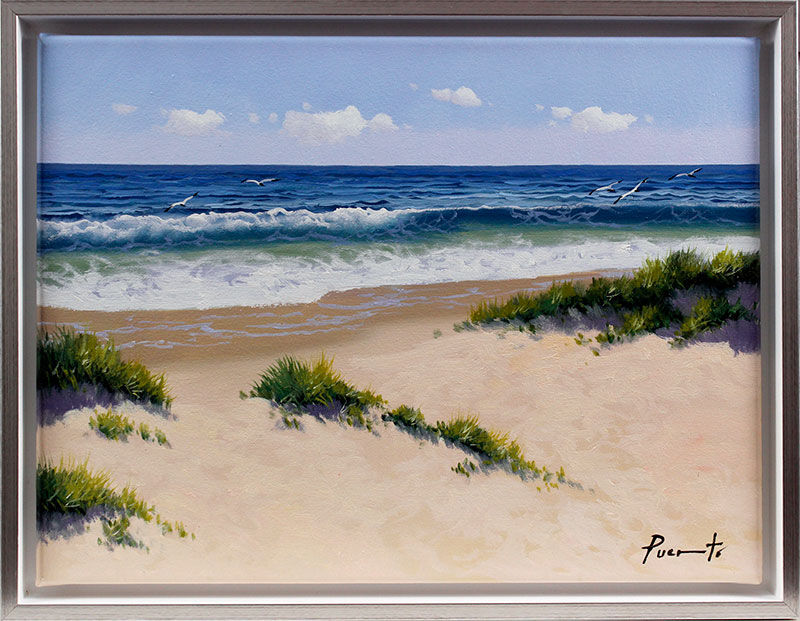 Joan Puerto hat dieses Werk als Künstlerleinwand auf Keilrahmen gearbeitet. Um diesem herrlichen Motiv "IN DEN DÜNEN" einen würdevollen Rahmen zu geben, wurde das Unikat in einem hochwertig gearbeiteten Schattenfugenrahmen perfekt in Szene gesetzt. Das Bild mit Rahmen hat ein Format von ca. 35x45 cm.