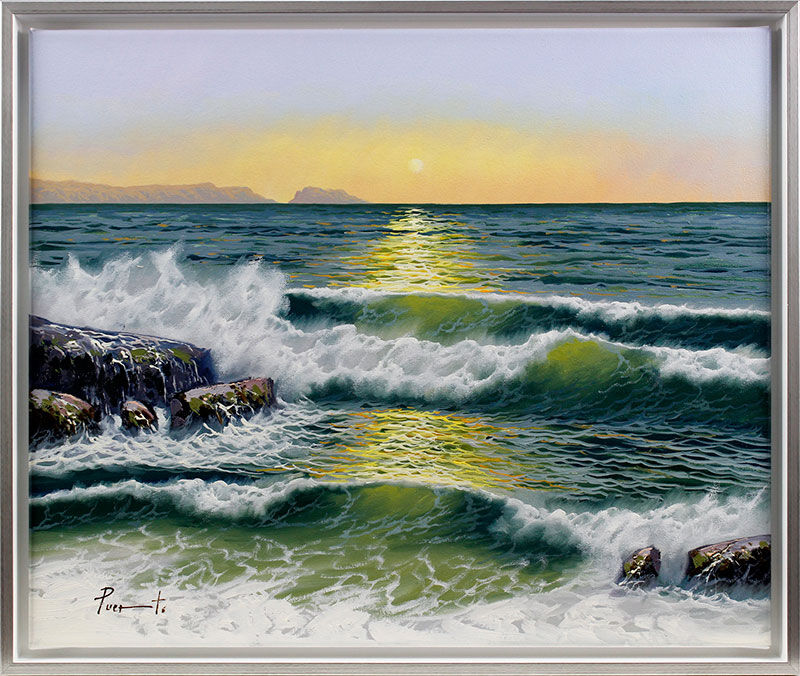 Joan Puerto hat dieses Werk als Künstlerleinwand auf Keilrahmen gearbeitet. Um diesem herrlichen Motiv "MEERESRAUSCHEN" einen würdevollen Rahmen zu geben, wurde das Unikat in einem hochwertig gearbeiteten Schattenfugenrahmen perfekt in Szene gesetzt. Das Bild mit Rahmen hat ein Format von ca. 50x60 cm.