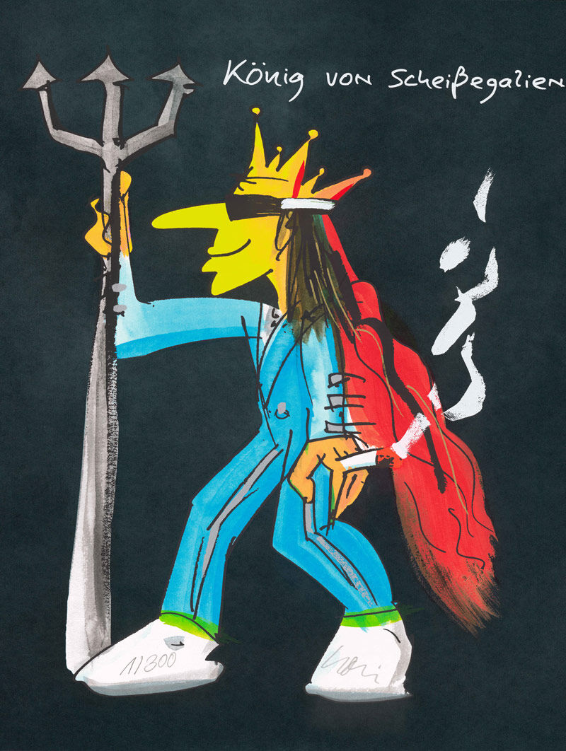König Udo mit Kippe, Krone und Dreizack. Lindenberg ist einfach ein echtes Unikum, mit dem man gerne mal an der Theke stehen und einen Plausch halten möchte. Denn beim Genuss eines Gläschens Eierlikör sind dem Künstler manchmal seine witzigsten Lebensweisheiten eingefallen. Das Motiv " KÖNIG VON SCHEISSEGALIEN " ist wieder ein witziger Beleg für Udo's herrliche, unnachahmliche Art.