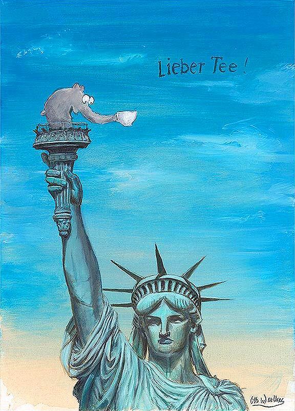 Der Ottifant reicht den Ostfriesentee der Freiheitsstatue Liberty - oder ob Sie lieber einen Kaffee bevorzugt? Nein - ganz klar, "Lieber Tee !"