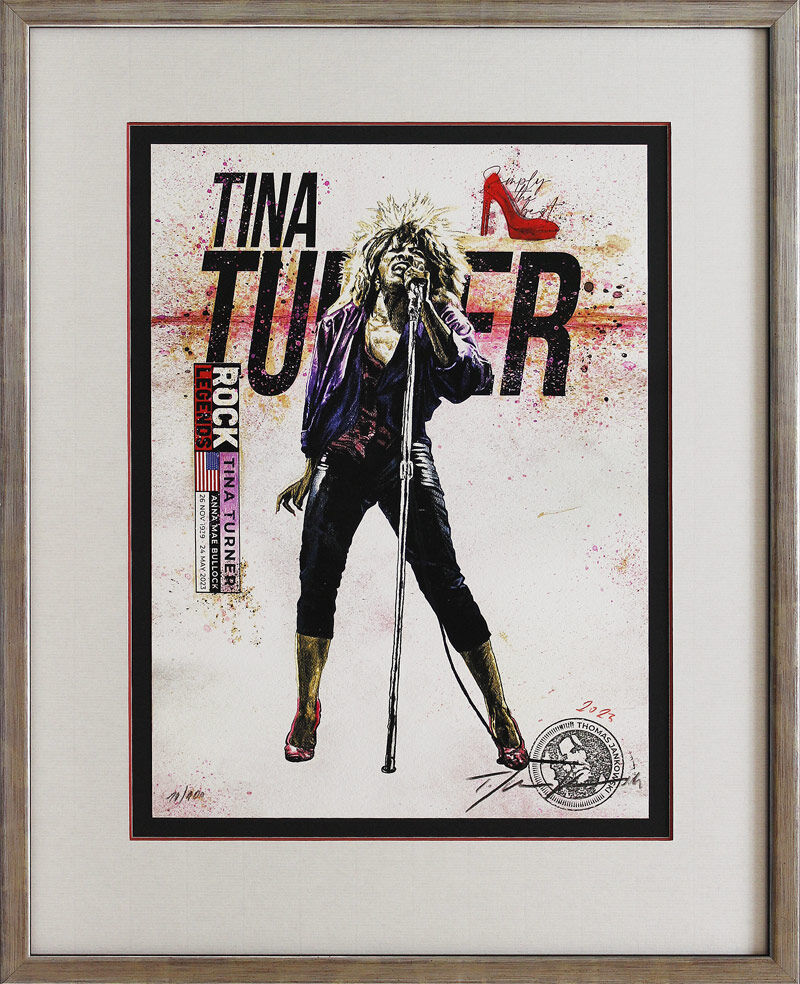 Sie können "TINA TURNER" von Thomas Jankowski auch in einem Passepartout, edlen Holz-Bilderrahmen sowie bruchfestem Bilderglas bestellen. Mit Rahmen hat das Bild ein Außenmaß von ca. 40 x 50 cm.