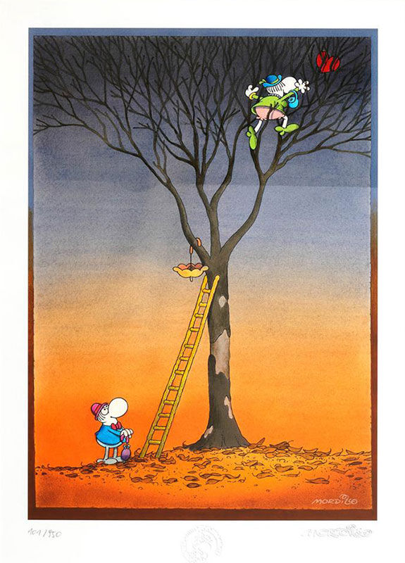 Der Künstler weigerte sich zeitlebens seine Original-Zeichnungen auf den Kunstmarkt zu bringen. Mit den hochwertigen limitierten Pigmentgrafiken seiner Bilder schuf Mordillo jedoch eine ausgezeichnete Alternative für jeden Liebhaber seiner Motive.