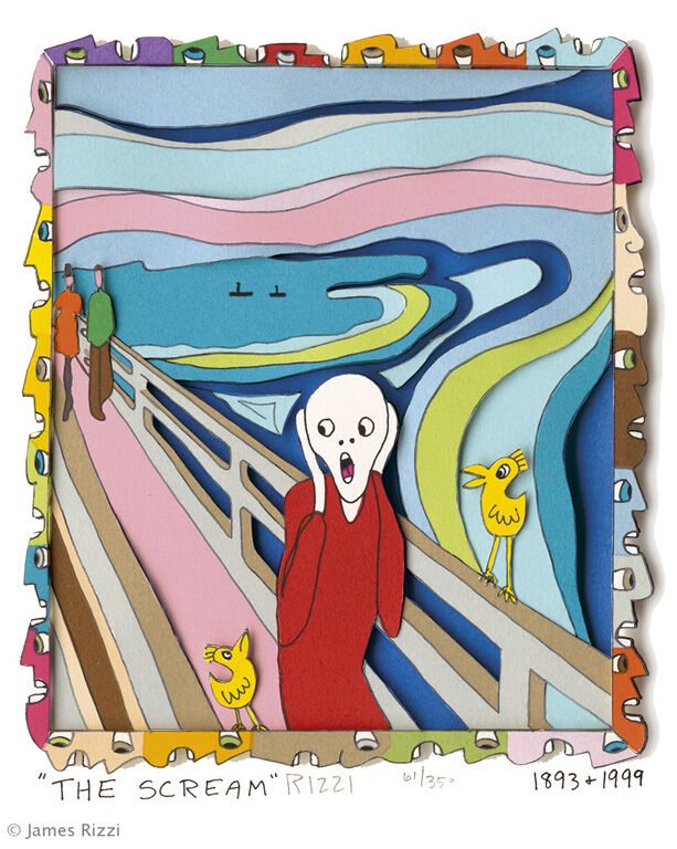 Sie erhalten ein Exemplar aus der James Rizzi "Künstlerserie" inspiriert durch bekannte Klassiker der Kunstgeschichte. Vorlage war hier Edvard Munch's "Der Schrei" von 1893. Nutzen Sie diese seltene Gelegenheit um noch ein original handsigniertes James Rizzi 3D Bild zu kaufen. Der Kunstmarkt ist nahezu leer gefegt. Aufgrund der großen Nachfrage gibt es kaum noch handsignierte Rizzi Bilder.