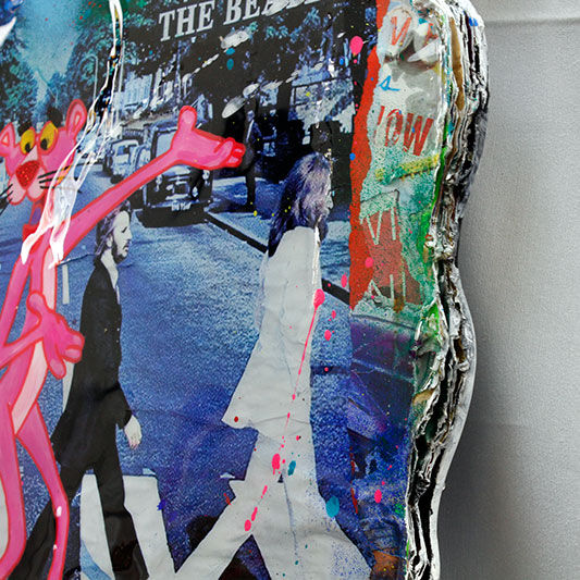 Die beeindruckende Unikat Pop Art Collage "HELLO ABBEY ROAD" von Tanja Kiesewalter aus ihrer "Crazy Clouds" Kollektion ist eine Hommage an die Beatles und ihr Album "Abbey Road". Außer John Lennon, Paul McCartney, George Harrison und Ringo Starr sind auch noch der Pink Panther sowie Inspektor Clouseau zu sehen.