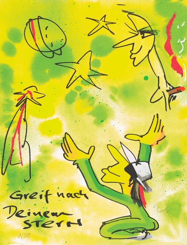 Mut, Hoffnung und der unbedingte Willen, alles zu erreichen, was man sich vornimmt. Dafür steht "GREIF NACH DEINEM STERN". Es ist eines der beliebtesten Motive von Udo Lindenberg. Jetzt hat Udo Lindenberg es in einer fetzigen Edition 2023 in leuchtenden Grüntönen völlig neu überarbeitet.
